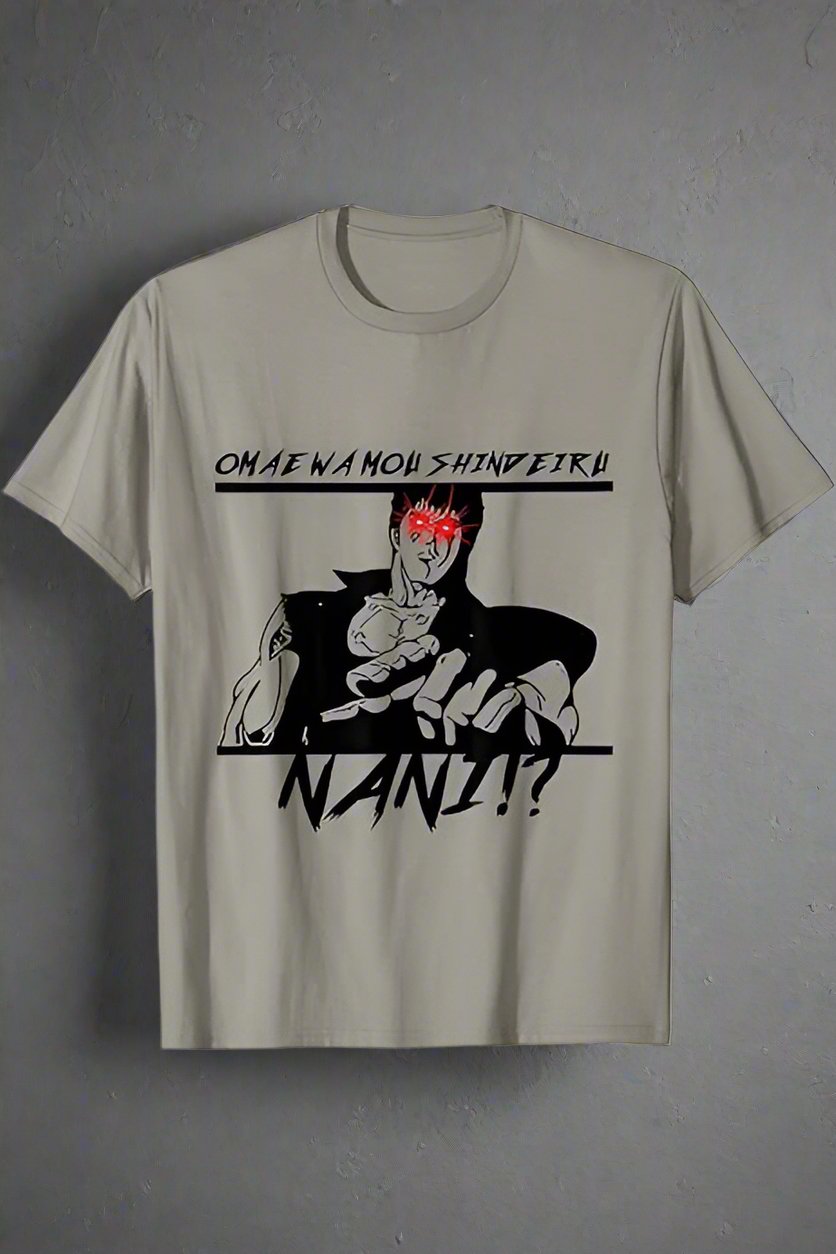 Step into the world of classic anime with our 'Already Dead' Legendary Meme Tee, where vintage meets viral in a stylish symphony of culture and cool. Made for the anime connoisseur who lives for those epic moments that define the genre, this shirt is crafted from 100% high-quality cotton, guaranteeing both comfort and durability. Emblazoned with the phrase "Omae Wa Mou Shindeiru" and the retort "NANI!?" this tee embodies the moment of surprised realization, capturing one of the most memed moments in anime history.