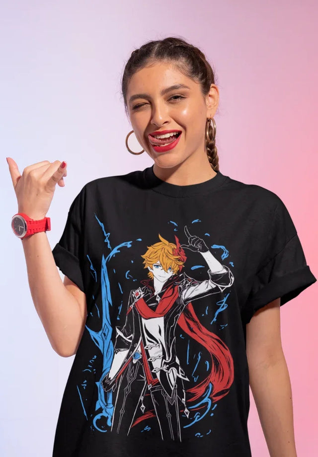 Celebrate your love for Genshin Impact with this Tartaglia T-Shirt, featuring a striking design of the popular character. Perfect for anime fans, this tee combines bold style with everyday comfort. The vivid artwork captures Tartaglia's dynamic essence, making this shirt a must-have for any collection.