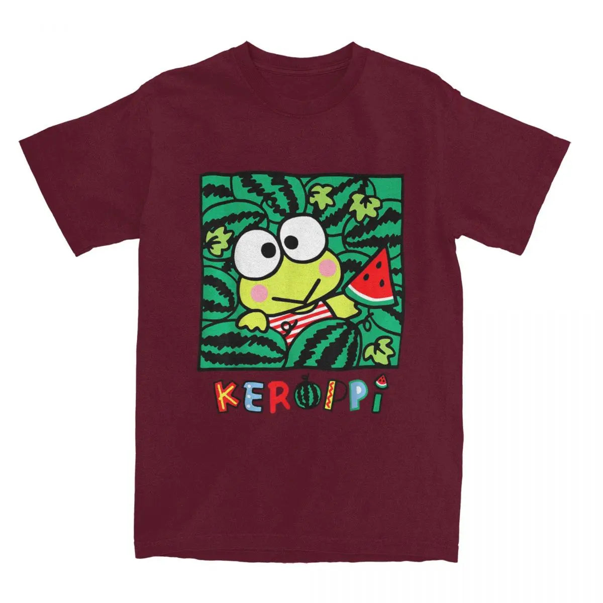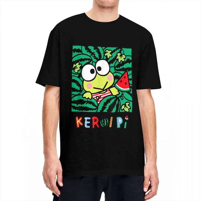 The shirt comes in a classic black background that accentuates Keroppi's vibrant colors as he enjoys a juicy slice of watermelon, adding a touch of playful fun to your wardrobe. Available in a variety of colors including sophisticated navy blue, rich burgundy, and versatile grey, this tee provides a pop of personality to any outfit. It’s perfect for Sanrio enthusiasts or anyone who appreciates a splash of cute in their daily ensemble. Don’t miss out on this adorable Keroppi tee – a sweet addition to any collection!
