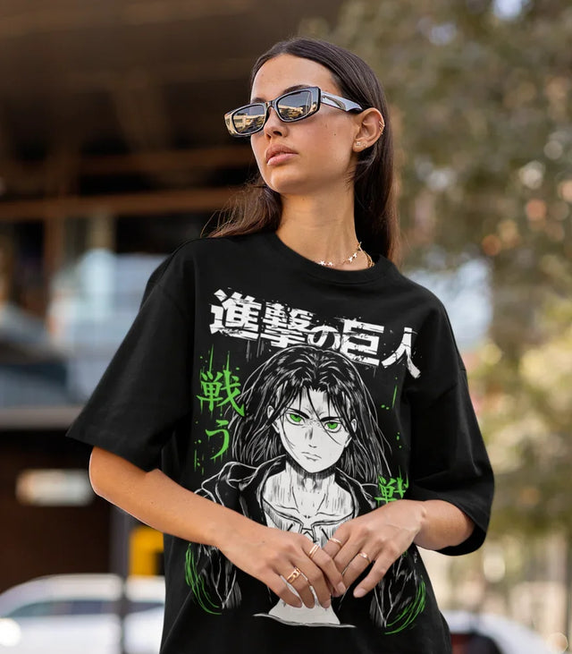 - Powerful Eren Yeager Design: The tee showcases a striking image of Eren Yeager with his piercing green eyes, ready for battle. The Japanese text adds an authentic touch, making this shirt a perfect homage to the epic series.