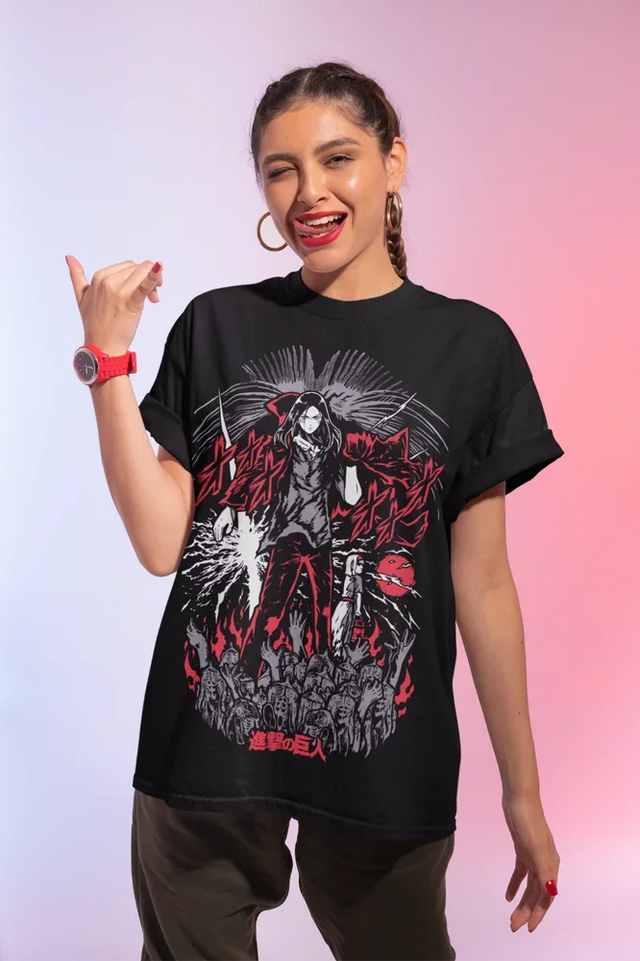 Unleash the power of the Founding Titan with this Eren Yeager T-Shirt, featuring a striking design inspired by the epic moments from Attack on Titan. Perfect for fans of Shingeki No Kyojin, this tee captures the dark and intense aura of Eren in his most powerful form. The bold artwork highlights the raw energy and determination of Eren Yeager, making this shirt a must-have for any Attack on Titan fan.