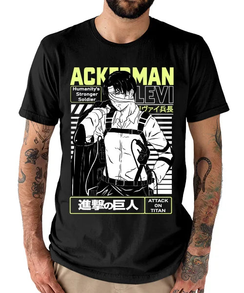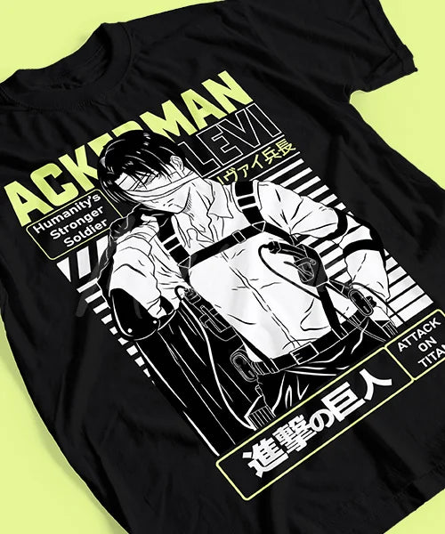 Stand tall with humanity’s strongest soldier by your side in the Levi Ackerman Soldier Tee from Attack on Titan. This powerful design showcases Levi in his iconic military gear, ready for battle with a look of fierce determination. The bold black and white artwork, highlighted with striking neon details, perfectly captures Levi's commanding presence and strength. Whether you're gearing up for a fight or showing off your fandom, this tee is the perfect way to channel the strength of the Scout Regiment's finest.