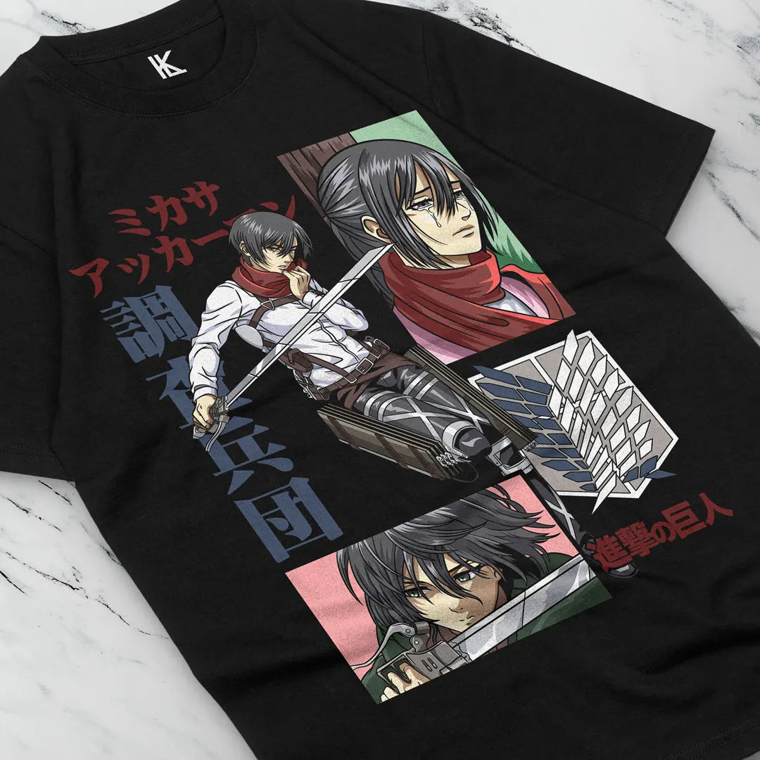 Gear up with the strength and resilience of Attack on Titan's Mikasa Ackerman. This tee features three dynamic illustrations of Mikasa in action, perfectly capturing her fierce loyalty and unmatched combat skills. Whether you're slashing through the day or standing your ground, this tee is a must-have for any Attack on Titan fan.
