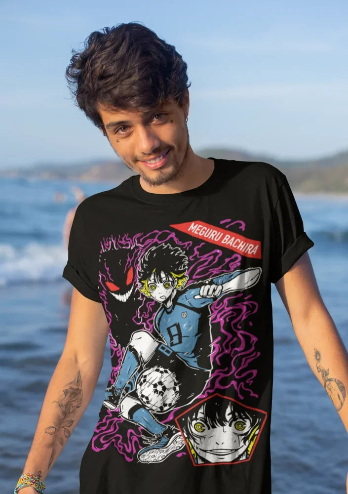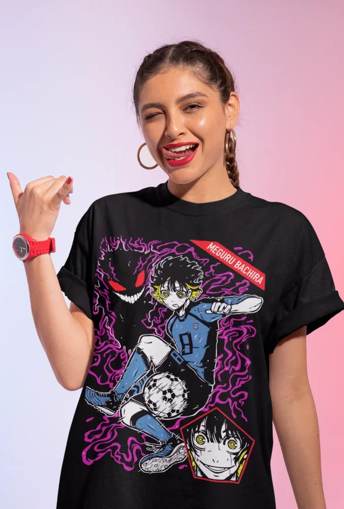 Step into the world of Blue Lock with this electrifying Meguru Bachira T-Shirt! Perfect for fans of the intense soccer anime, this tee captures the spirit and energy of Bachira, known for his fierce playing style and unpredictable moves on the field. The design features a dynamic illustration of Bachira in action, surrounded by vibrant purple energy that reflects his unique and wild personality.