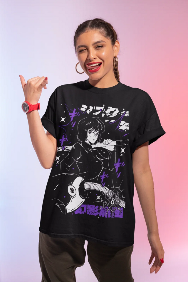 Show your love for Hunter x Hunter with this sleek Shizuku Murasaki tee. Featuring a bold design of the Phantom Troupe member, this shirt is a perfect addition for any anime fan.