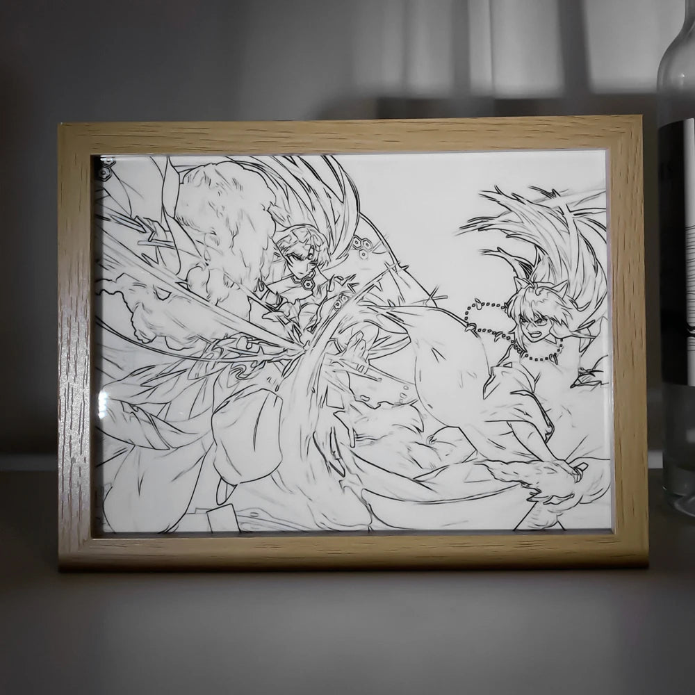 🌟 Elegant Artwork: Showcased within a sleek wooden frame, this LED light box highlights a beautifully rendered image of Sesshomaru and Rin, brought to life with vibrant colors and intricate details. It's not just a night light; it's a piece of art.