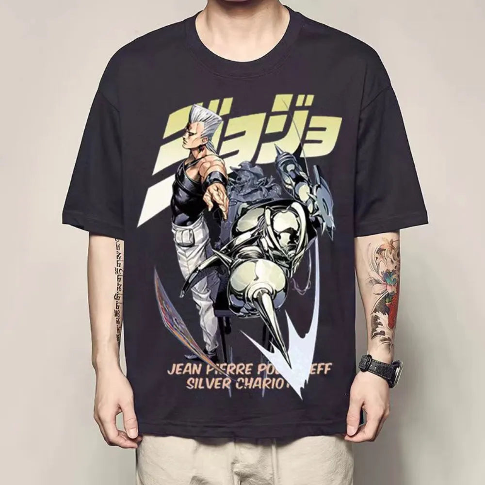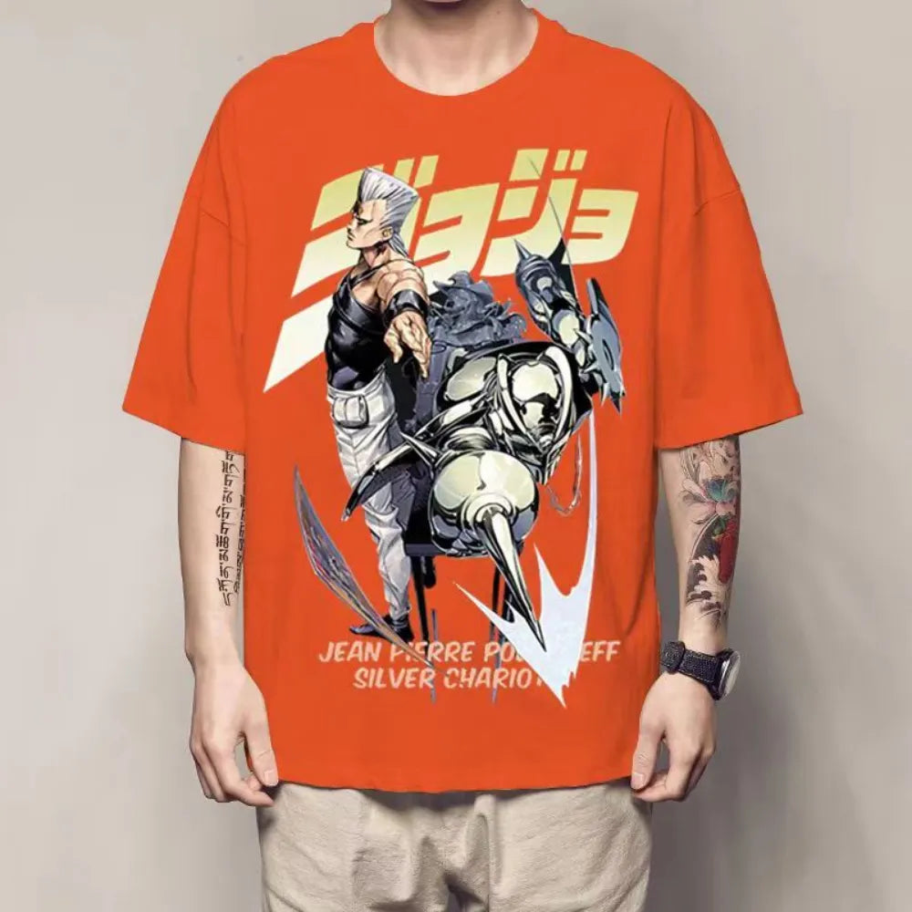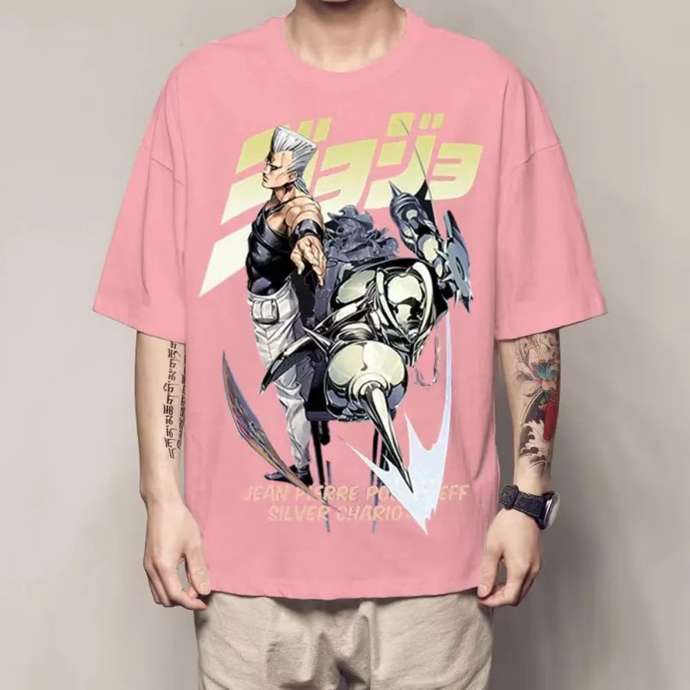 Showcase your love for JoJo's Bizarre Adventure with this Jan Pierre Polnareff Anime T-Shirt. Crafted for both men and women, this graphic tee features an eye-catching design of Polnareff and his Stand, Silver Chariot. Made from 100% high-quality cotton, this oversized short-sleeve tee ensures comfort and durability, making it perfect for summer wear. Available in a variety of vibrant colors including White, Black, Khaki, Pink, and Orange, this shirt is a must-have for any anime enthusiast looking to make a bold fashion statement.