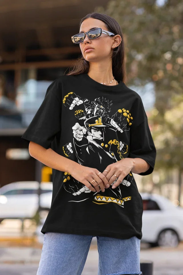 Unleash your Stand power with this dynamic Jojo's Bizarre Adventure T-shirt! Featuring iconic artwork from the legendary anime and manga series, this tee showcases the intense energy and style that Jojo's is known for. The bold design is perfect for fans who want to represent their favorite Jojo characters and their Stands.