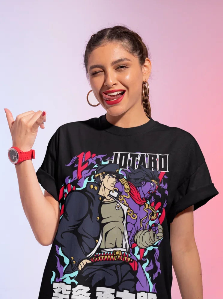 Step into the world of JoJo's Bizarre Adventure with this iconic Jotaro Kujo t-shirt. Featuring a bold design of Jotaro and his stand, Star Platinum, this tee is a must-have for any JoJo fan. The striking colors and dynamic artwork capture the essence of the series, making it a standout piece in your anime collection.