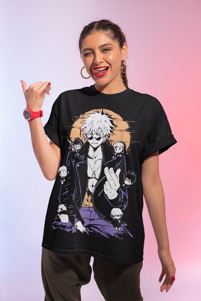 Show your love for Jujutsu Kaisen with this epic Gojo Satoru tee, featuring the fan-favorite sorcerer and his crew in stunning detail. The bold design highlights Gojo’s confident stance and the vivid personalities of the characters around him, making this a must-have for any anime fan’s wardrobe.