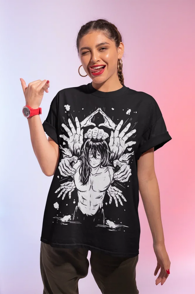 Unleash the power of curses with this striking Mahito T-shirt from Jujutsu Kaisen! Featuring the menacing and unpredictable curse, Mahito, this T-shirt captures the essence of his terrifying abilities and chaotic nature. The design showcases Mahito in a haunting pose, surrounded by the manifestation of his cursed techniques, making it a must-have for any fan of the series.