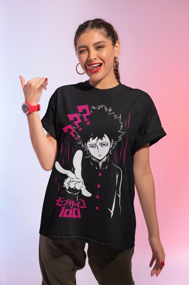 - Dynamic Mob Design: This shirt showcases Mob in a powerful stance, with his signature expression and mysterious aura. The bold use of colors and manga-inspired elements makes this a must-have for any fan of Mob Psycho 100.