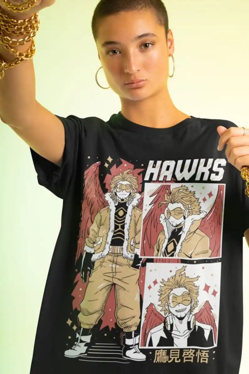Dive into the world of My Hero Academia with this bold Hawks Style Tee, showcasing Keigo Takami in his iconic hero attire. Perfect for fans who admire his swift moves and charismatic personality, this shirt captures Hawks’ essence with vibrant artwork and striking details that make it stand out in any crowd. Designed for comfort and style, it’s a must-have for any anime lover looking to add some hero flair to their wardrobe.