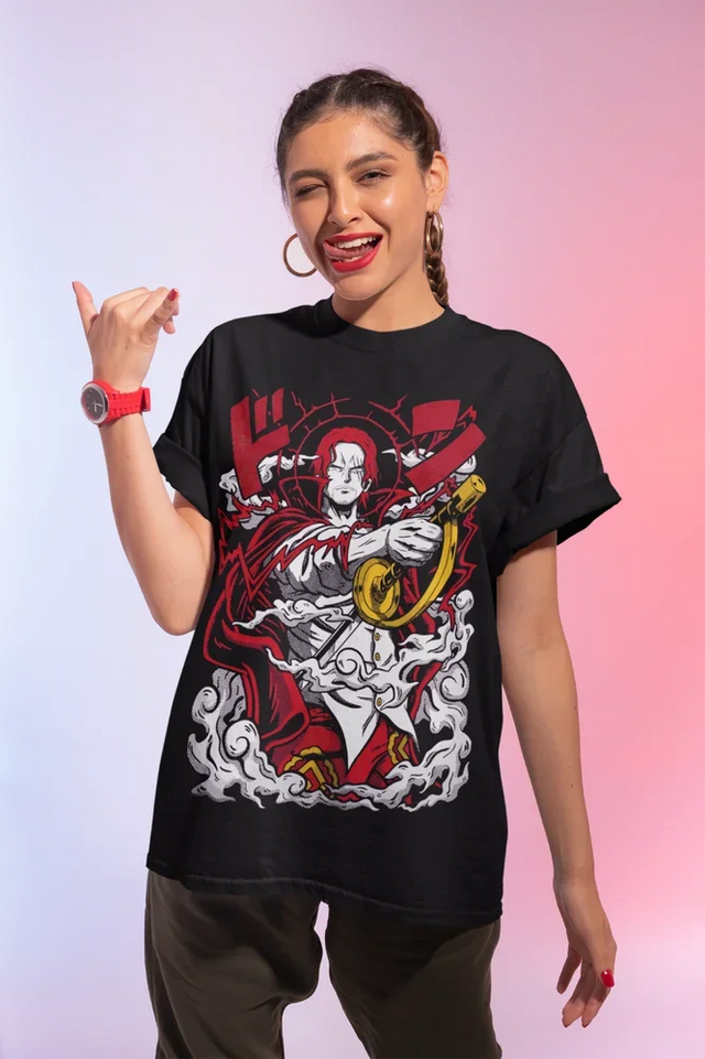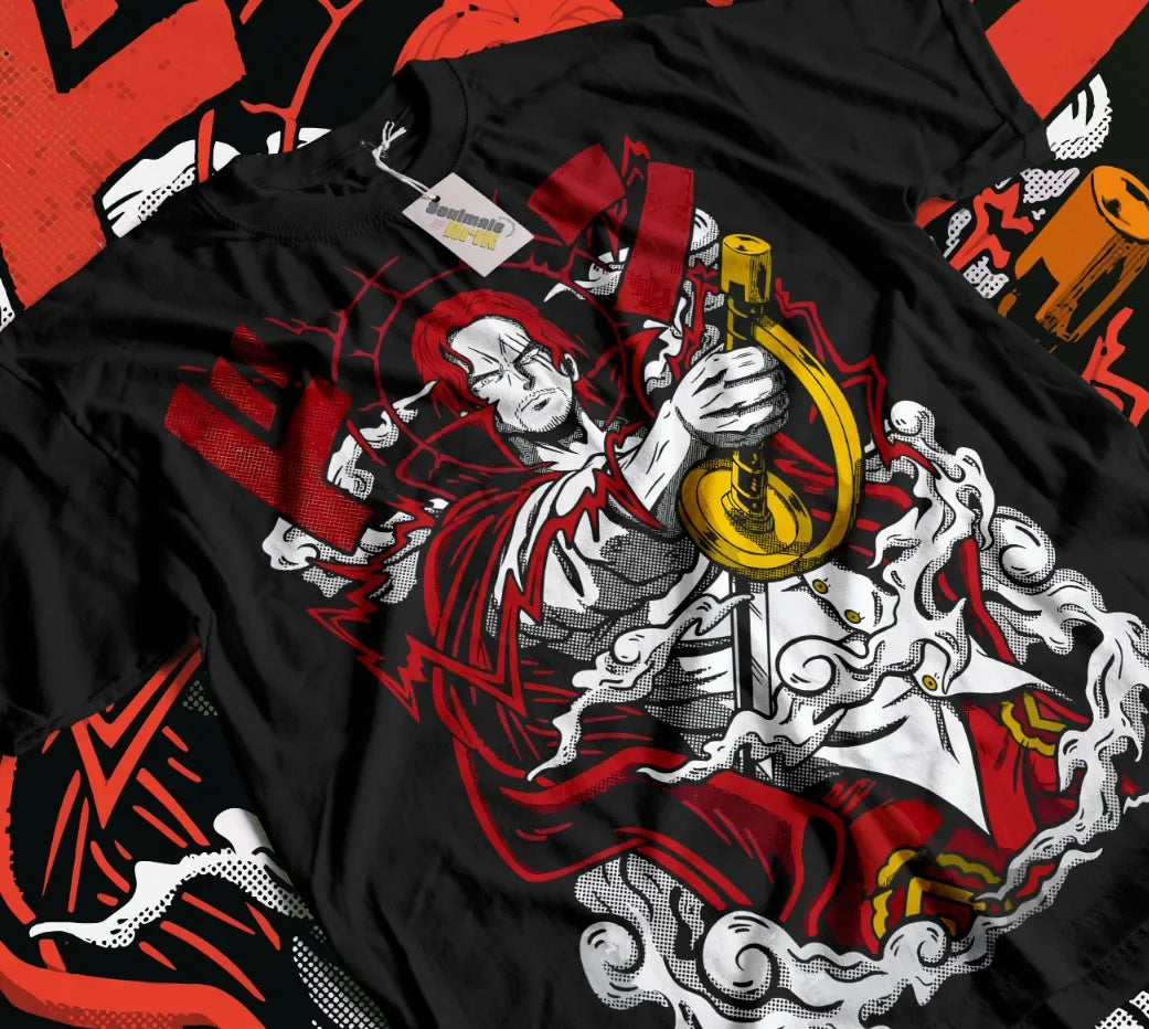 • Epic Shanks Design: Featuring a bold and powerful illustration of Shanks wielding his sword, this design is a tribute to the legendary pirate captain. The vintage style and vibrant red and gold colors make this tee a standout piece in any anime lover's wardrobe.