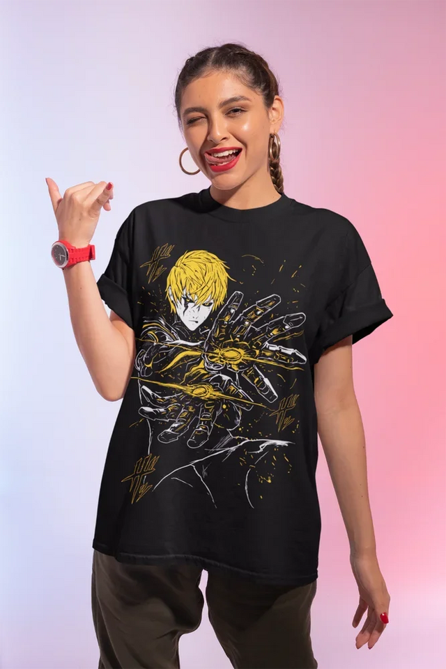 - Dynamic Genos Design: This tee showcases Genos in an intense battle pose, with his mechanical arms ready to unleash a powerful blast. The vibrant yellow and black color scheme highlights the character's fierce determination and strength.