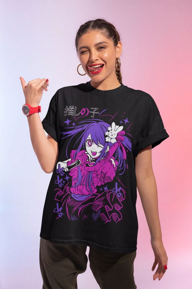 Show your love for the iconic Ai Hoshino from "Oshi No Ko" with this vibrant and stylish t-shirt. Featuring a stunning design of Ai in her idol persona, this tee captures her energetic spirit and charm perfectly. The bold colors and intricate details make this shirt a standout piece for any anime fan.
