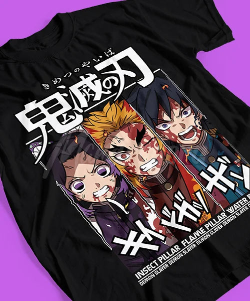 Step into the world of Demon Slayer with this striking tee featuring the Insect Pillar Shinobu, Flame Pillar Rengoku, and Water Pillar Giyu. Show your love for the Hashira trio with this vibrant and dynamic design, perfect for any fan of the series. Designed for comfort and style, it’s the ultimate addition to your anime wardrobe.