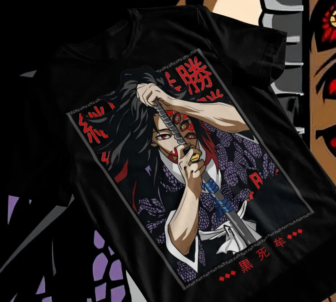 Channel the mysterious aura of Kokushibo with this Demon Slayer Tee! Featuring the fierce Upper Moon One with his iconic blade, this shirt is a must-have for fans of the series. Perfect for casual wear or showing off your love for Demon Slayer at events.
