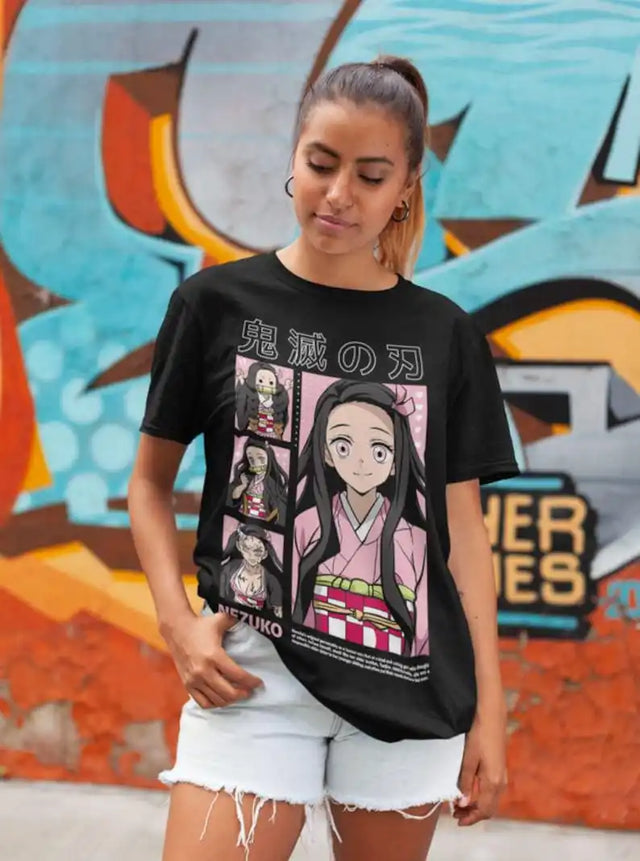 Celebrate the journey of Nezuko Kamado with this captivating tee showcasing her transformation and iconic moments. From her gentle smile to her fierce demon form, this shirt captures every side of Nezuko that Demon Slayer fans adore. Perfect for those who connect with Nezuko’s resilience and love for family.