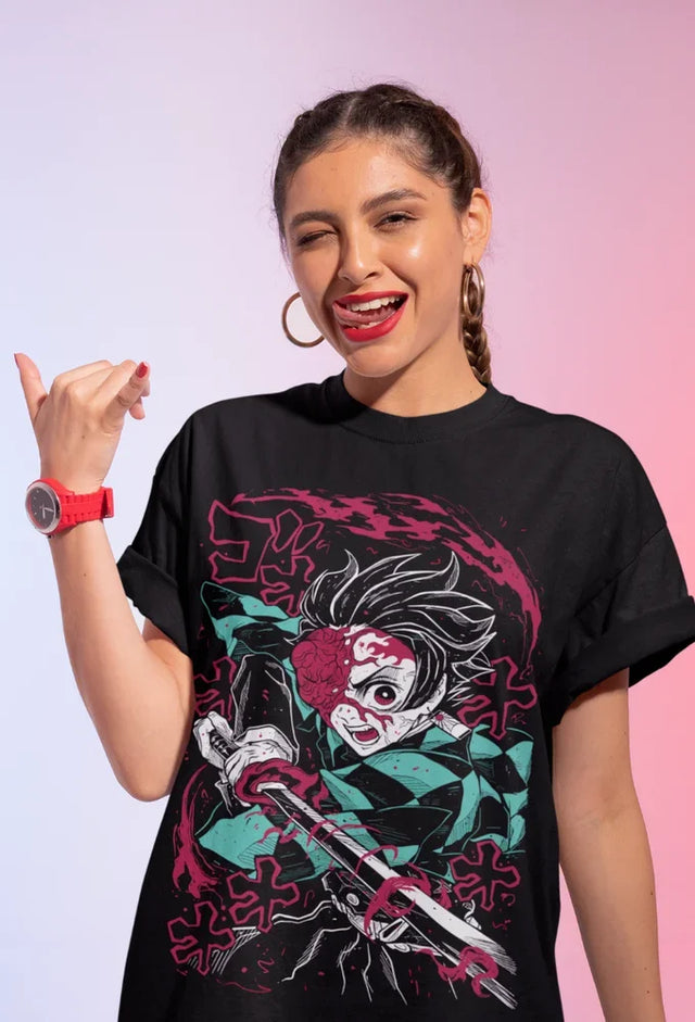 Embody the spirit of a true Demon Slayer with this stunning Tanjiro Kamado T-shirt. Showcasing the fierce and determined protagonist of Kimetsu no Yaiba, this tee captures Tanjiro mid-battle, wielding his iconic Nichirin blade with unparalleled intensity. The vivid design, featuring bold red and green hues against a deep black background, brings out the raw emotion and power of Tanjiro as he fights to protect his sister Nezuko and avenge his family.