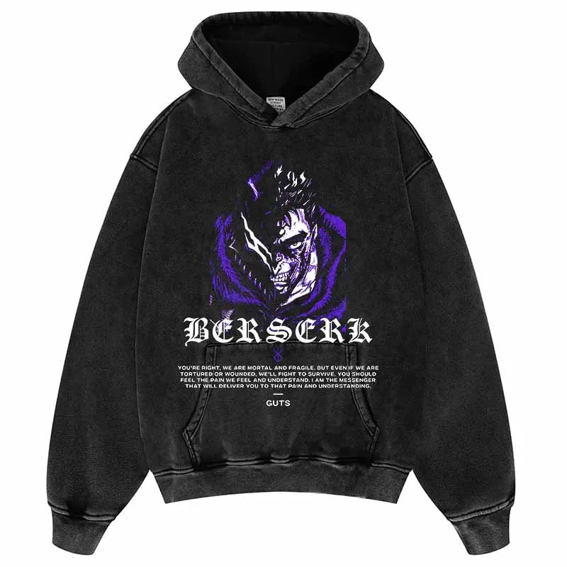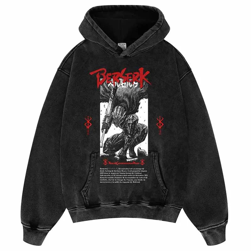 Embrace the intense world of "Berserk Guts" with a hoodie that is more than just apparel; it's a statement of your passion for this profound anime saga. Ideal for any fan looking to add a touch of Guts' fearless spirit to their everyday style.