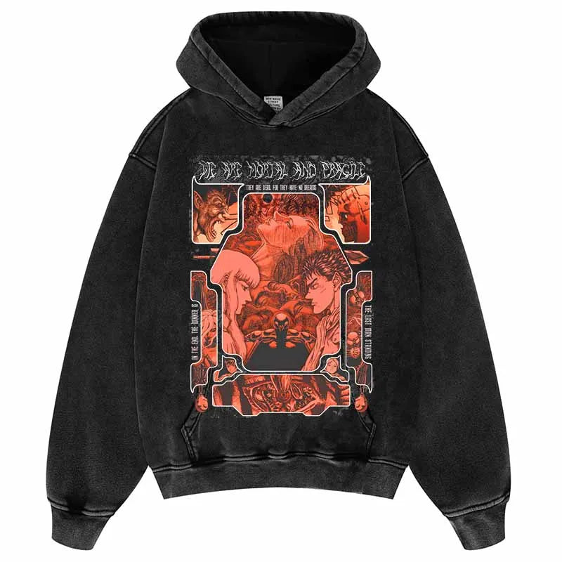 Step into the dark, captivating world of "Berserk Guts" with our exclusive collection of graphic hoodies. Designed for the true fans, these hoodies come in an impressive range of 20 styles - 18 in the enigmatic acid washed black and 2 in the subtly powerful acid washed sand, each echoing the intense saga of Guts.