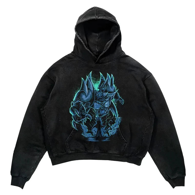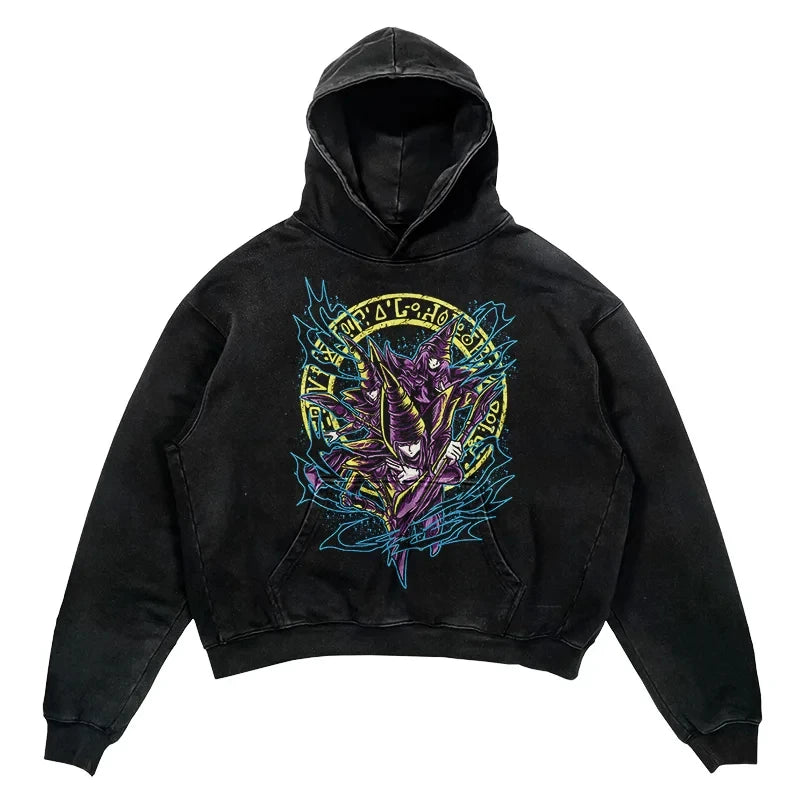Summon the heart of the cards with the "Duelist’s Dream: Yu-Gi-Oh Retro Graphic Hoodie," a must-have garment for any fan of the legendary card-dueling anime. Imported from Japan, the birthplace of Yu-Gi-Oh, this hoodie melds nostalgic artwork with contemporary street fashion, creating a piece that's as unique as it is comfortable.