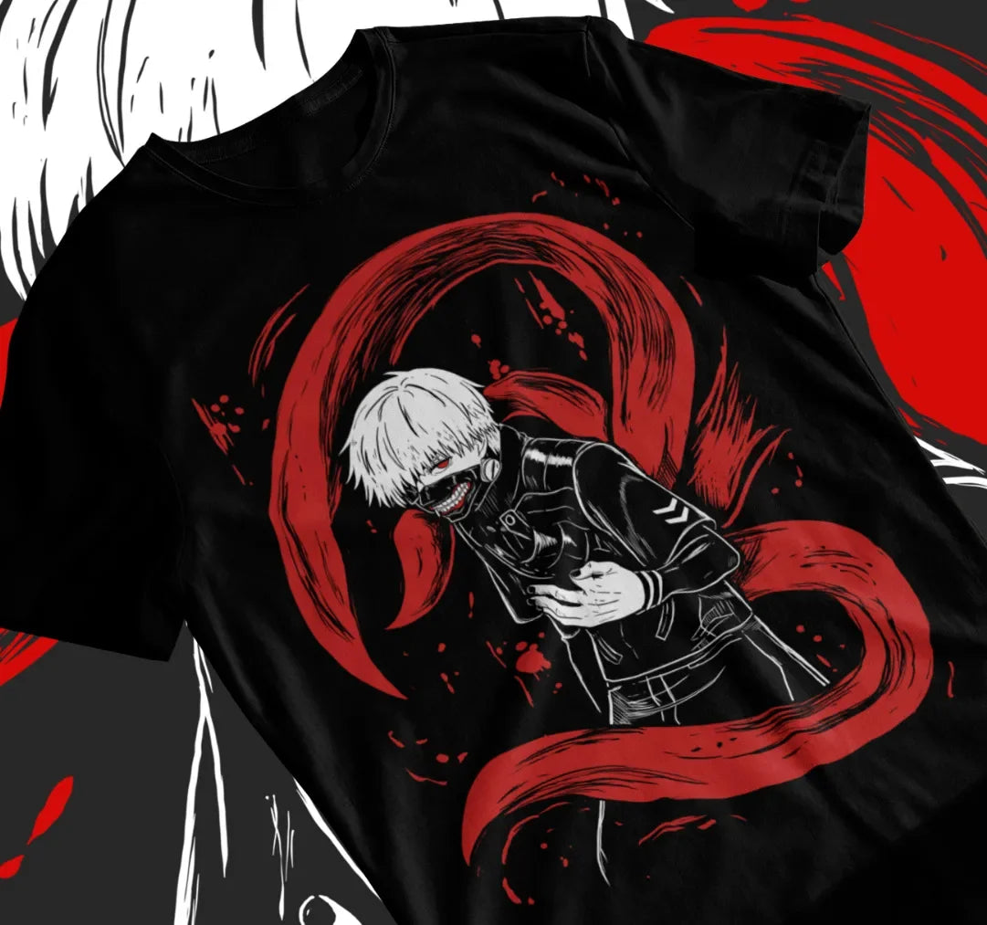 - Intense Kaneki Design: Showcase your love for Tokyo Ghoul with this dramatic tee featuring the iconic Kaneki in a striking red and black design.